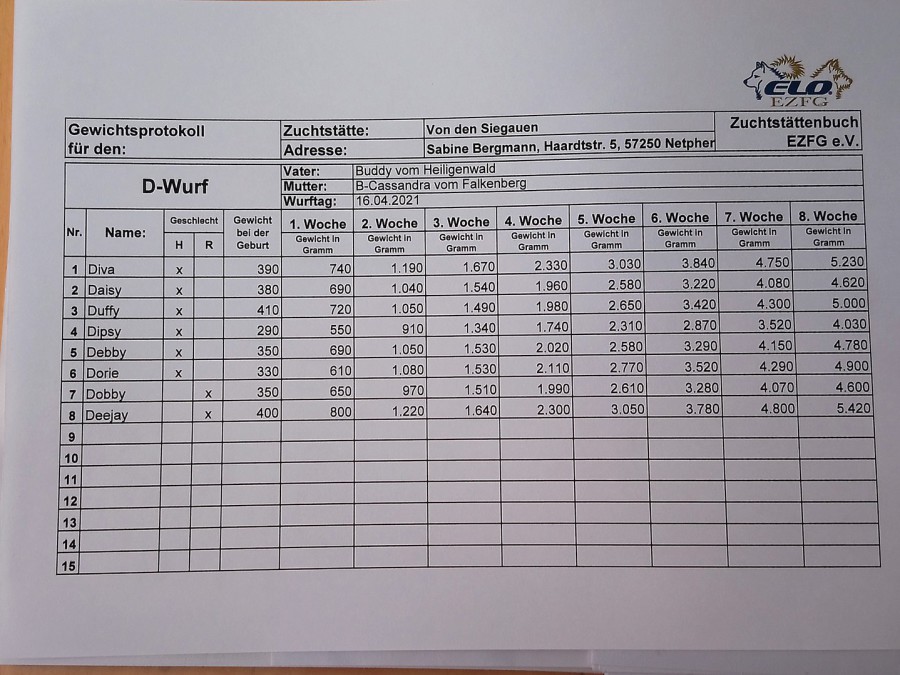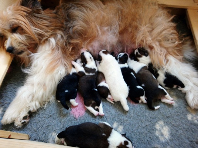 Nach einer durchhechelten, langen Nacht hat unsere Cassy am 16.04.2021 in der Zeit zwischen 12.48 Uhr und 16.35 acht gesunde Welpen zur Welt gebracht!
