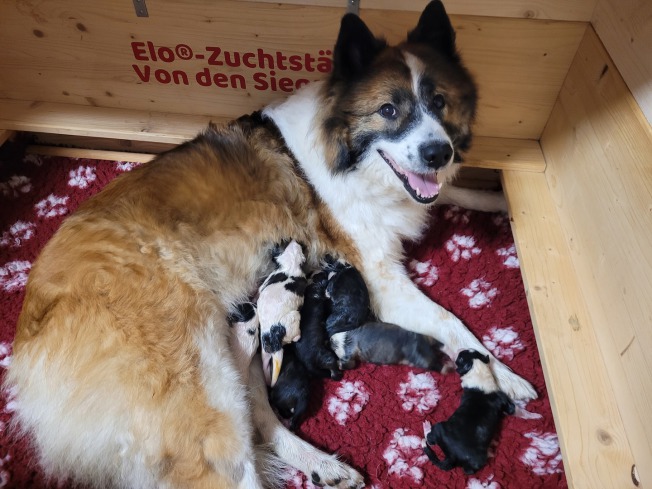 Heute hat Ilayda fünf gesunde Welpen zur Welt gebracht. Vier Rüden und ein Weibchen. Drei schwarz-weiße und zwei Braun/Rot-weiße. Mutter und Welpen sind gesund und munter. Mehr auf der Seite "Aktueller Wurf", "A-Wurf".